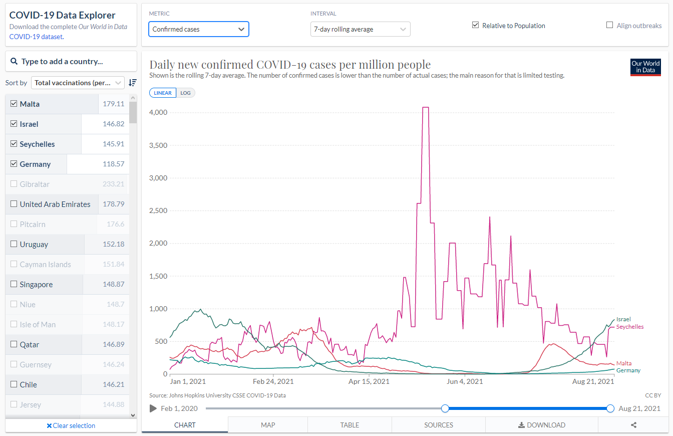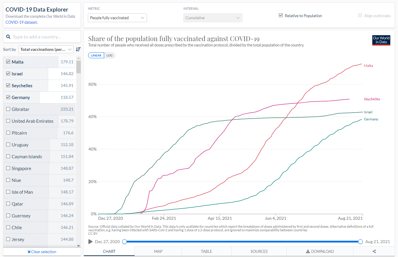 In der nachfolgenden Galerie habe ich die Länder aufgeführt, die nach den Daten von „Our World in Data“ die höchsten Impfquoten aufweisen. Zum Vergleich habe ich die Zahlen von Deutschland mit in die Graphiken aufgenommen. Insgesamt enthält die Galerie drei Graphiken, in denen die Länder Seychellen, Israel, Malta und Deutschland miteinander verglichen werden.