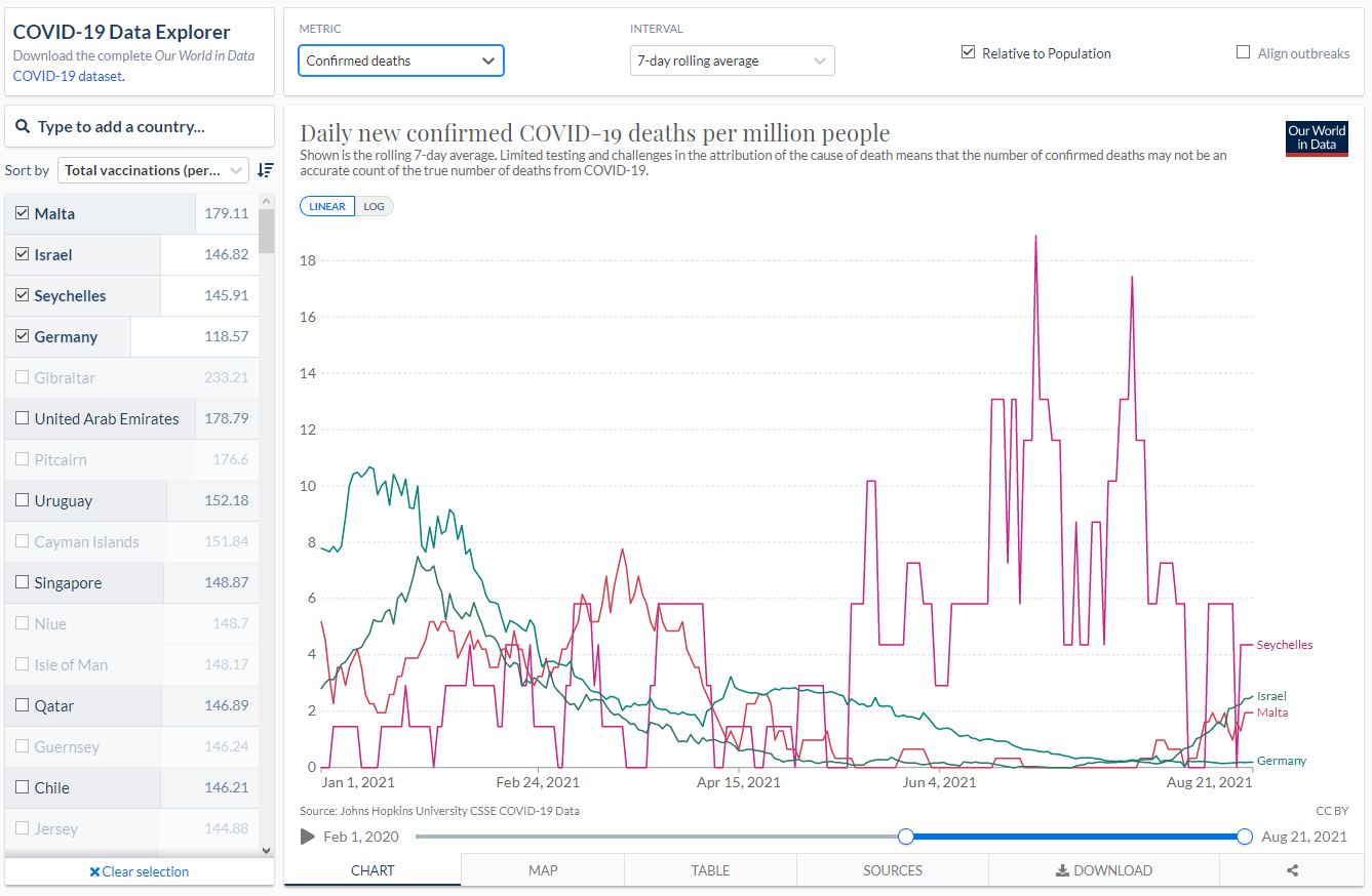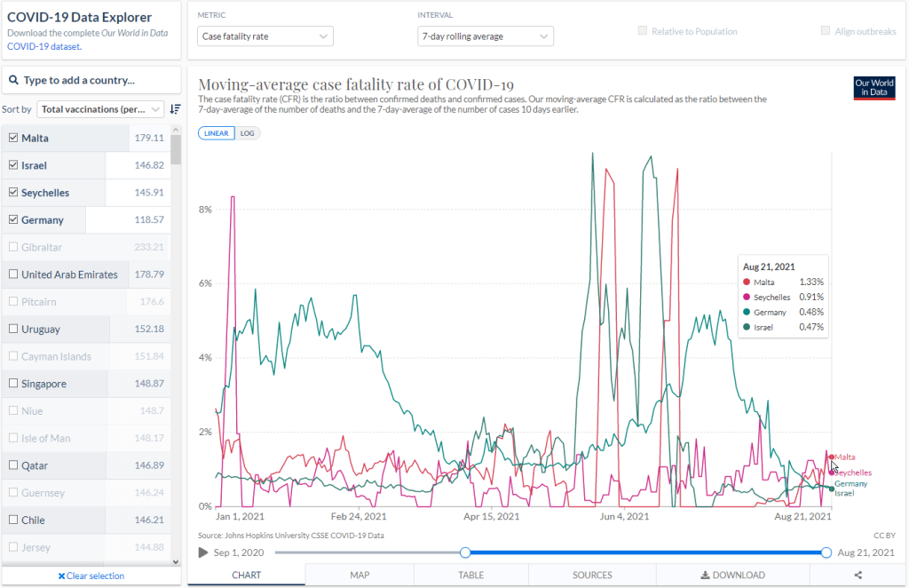 Die sogenannte „sterile Immunität“ ist also längst vom Tisch. Während zu Beginn der Impfkampagne die Hoffnung geschürt wurde, Geimpfte könnten völlig aus der Infektionskette heraustreten, scheinen Auffrischungsimpfungen und weitere Impfdosen in der nahen Zukunft die wahrscheinlichere Aussicht zu sein. Es bedarf also weiterer Impfstoffforschung, um mit neuen „Updates“ der Mutationsgeschwindigkeit des Virus beizukommen. Wir befinden uns also in einem Wettlauf mit dem Corona-Virus. Das nächste Argument, das bei einer Impfentscheidung bedacht werden sollte, ist der persönliche Schutz im Falle einer tatsächlichen Covid-Erkrankung. In den Medien tauchen derzeit Berichte auf, dass in Ländern mit hohen Impfquoten dennoch eine hohe Sterblichkeit bestünde. OE24 titelt am 13. Juli 2021 „Trotz Impf-Rekord: Corona-Zahlen in Israel explodieren„. Ein Blick auf unsere Vergleichsländer zeigt folgende Graphik. Im folgenden Bild sehen wir den 7-Tage-Durchschnitt des Anteils der im Zusammenhang mit Covid Gestorbenen. Wir sehen Malta auf Platz 1 mit einem Anteil von 1,33%, während Israel auf Platz 4 mit 0,47% liegt. Wenn wir auf die Bildergalerie weiter oben gucken, sehen wir jedoch, dass die Impfquote Maltas bei über 92% liegt.